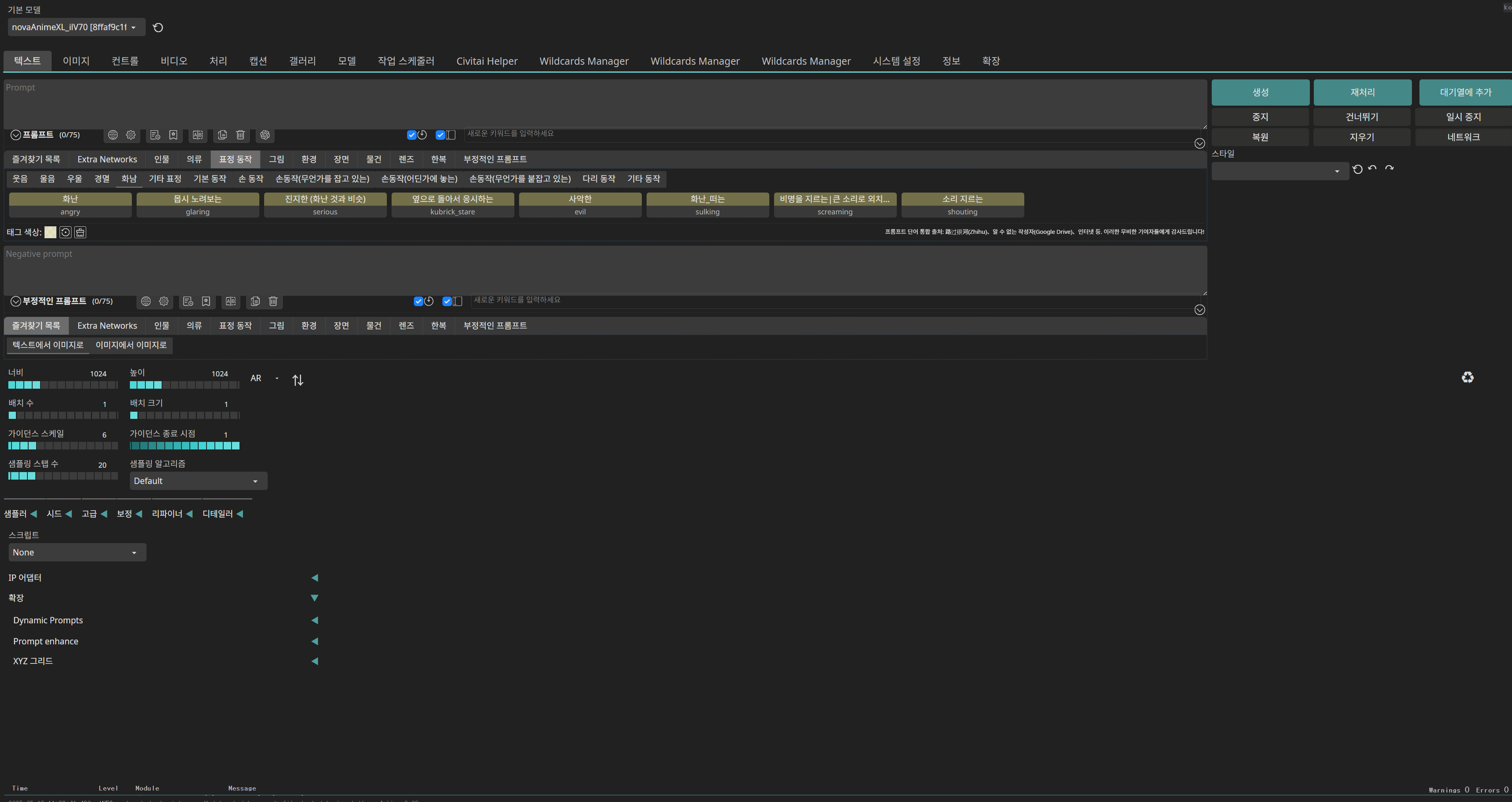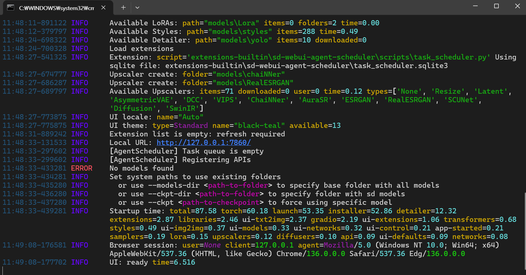 이후 다시 webui.bat를 실행하면 다음과 같이 정상적으로 작동하는 것을 확인 할 수 있다. 위의 캡쳐 내용 중 ERROR는 구동시킬 모델이 없기 때문에 뜨는 경고이기 때문에 Civitai나 기타 사이트에서 모델을 다운 받으면 뜨지 않는다. 이 버전이 다른 버전에 비해서 무겁기는 하지만 GPU 성능을 최대치로 뽑아주기 때문에 AMD 유저들에겐 필수적이지 않을까 생각된다.
