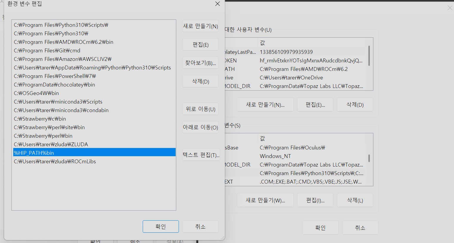 - HIP SDK 환경 변수 추가: HIP SDK 설치 후 시스템 환경 변수 편집 창을 열어 'Path' 변수에 %HIP_PATH%\bin을 추가한다. %HIP_PATH%는 HIP SDK 설치 시 자동으로 설정되는 환경 변수이다. 그리고 Strawberry Perl도 정상적으로 추가가 되어 있는지 확인한다. (설치 시 자동 Path 추가)