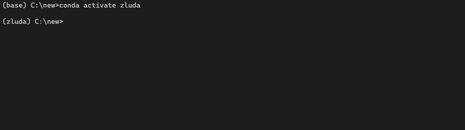 - Conda 환경 활성화: 환경 생성이 완료되면 다음 명령어로 zluda 환경을 활성화한다. 설치가 완료된 상태에서 바로 입력한다. 명령 프롬프트의 시작 부분이 (base)에서 (zluda)로 변경되면 환경 활성화가 성공한 것이다. 이제 이 환경에서 실행되는 모든 명령어는 zluda 환경에 설치된 Python과 패키지를 사용하게 된다.
