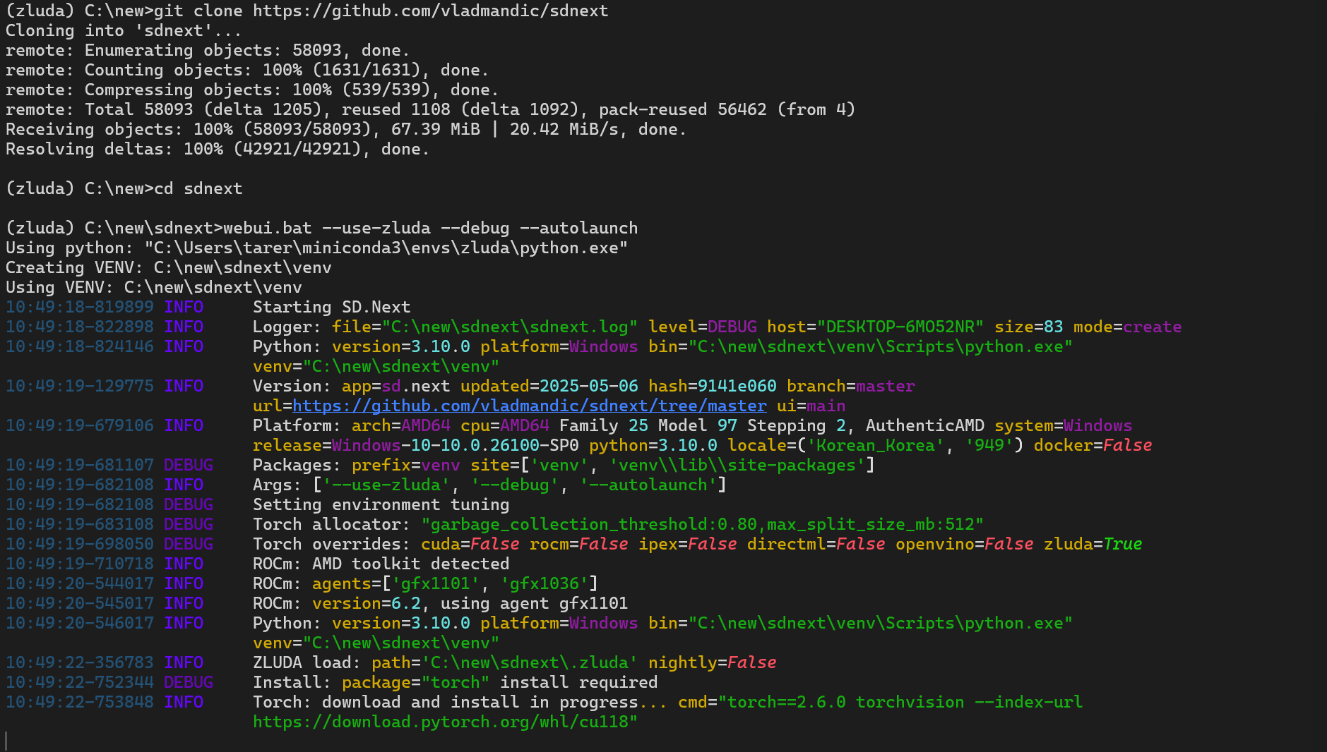 - SD.Next 클론: zluda 환경이 활성화된 상태에서 SD.Next 소스 코드를 다운로드한다. 현재 위치가 SD.Next를 설치할 폴더(C:\new)인지 확인한다. 이 명령어를 실행하면 C:\new 폴더 안에 sdnext라는 새 폴더가 생성되고, 그 안에 SD.Next 파일들이 복사된다.