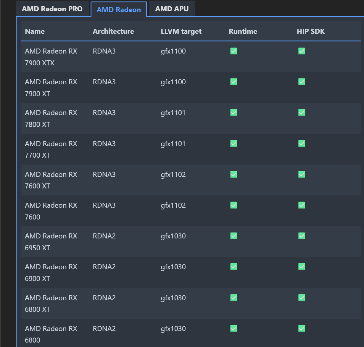 - 그래픽 카드 호환성 확인: 설치를 진행하기 전에 자신의 AMD 그래픽 카드가 HIP SDK 및 ZLUDA와 호환되는지 확인해야 한다. AMD 홈페이지 등에서 지원 모델 및 gfxXXXX 코드를 확인하는 것이 좋다. 예시로 RX 7800 XT는 gfx1011로 호환 가능하다. 아래 표를 참고하면 HIP SDK 지원은 최소 RX6800부터 가능하다.
